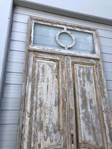 Pair of Framed 3 Panel Distressed Doors with Circle Transom